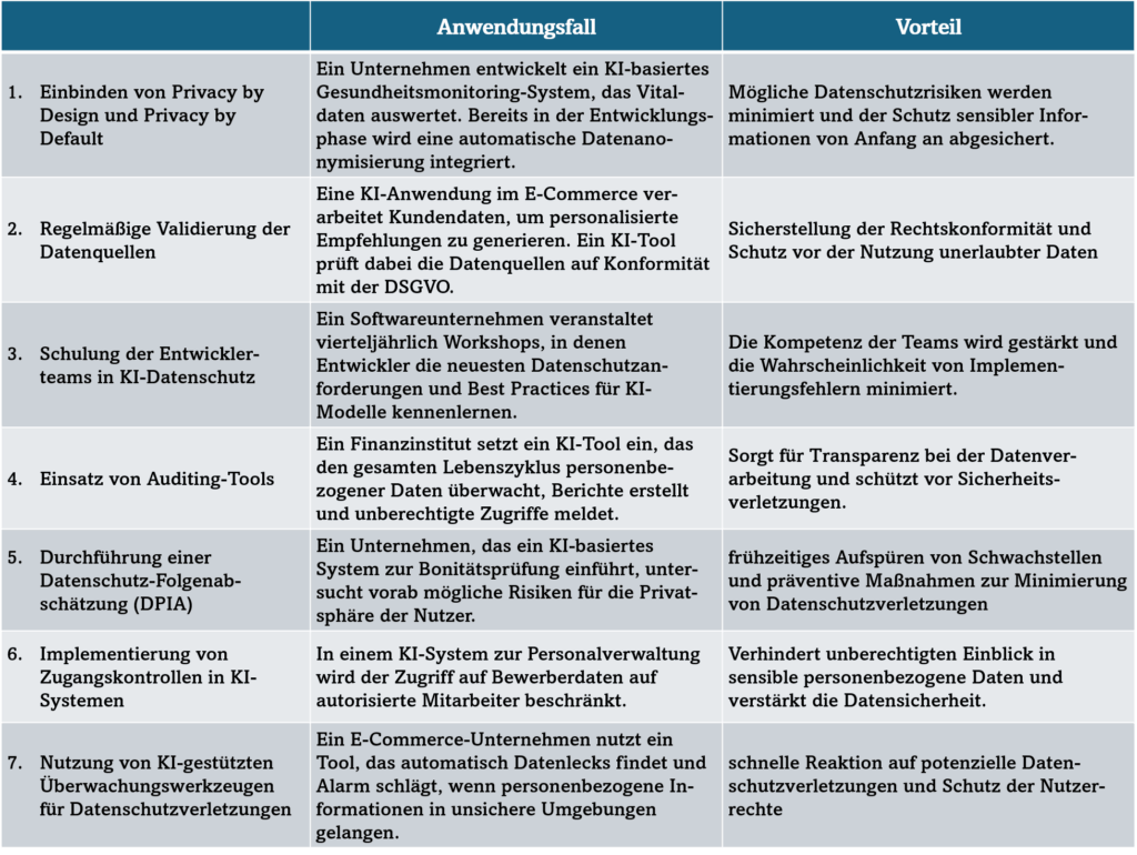 Um sicherzustellen, dass der Einsatz von KI im Einklang mit den geltenden Vorschriften erfolgt, sind die Datenschutzbehörden von wesentlicher Relevanz. Unternehmen sollten die folgenden Punkte berücksichtigen: